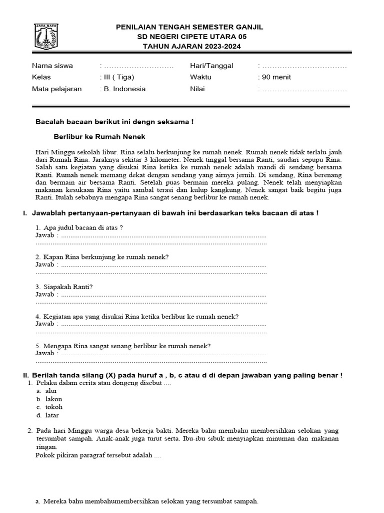 Format Soal UTS Bahasa Indonesia Kelas 3 Semester 1
