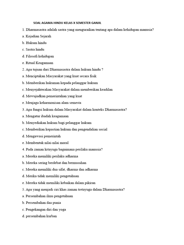 Contoh-contoh soal di atas hanyalah sebagian kecil dari materi yang dipelajari di kelas 10 semester 1 Kurikulum 2013. Dengan memahami konsep-konsep dasar agama Hindu dan berlatih mengerjakan soal-soal ujian, siswa diharapkan dapat memperoleh pemahaman yang komprehensif tentang agama Hindu dan mengaplikasikannya dalam kehidupan sehari-hari. Pembahasan yang mendalam pada setiap soal diharapkan dapat membantu siswa untuk memahami konsep-konsep agama Hindu secara lebih baik dan mempersiapkan diri menghadapi ujian dengan lebih percaya diri.